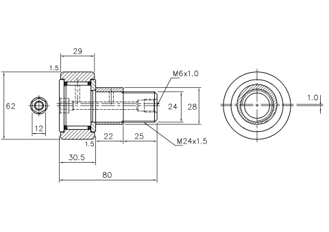 | 24 | CFE 24 | CFE 24 R | CFE 24 UU | CFE 24 UUR | 890 | 12 | 62 | M24 X 1.5 | 29 | 30.5 | 80 | M6 X 1.0 | 25 | 28 | 22 | 1.0 | 33 | 25.5 | 0.8 | 1.5 | 40 | 3,120 | 5,370 | 6,500 |